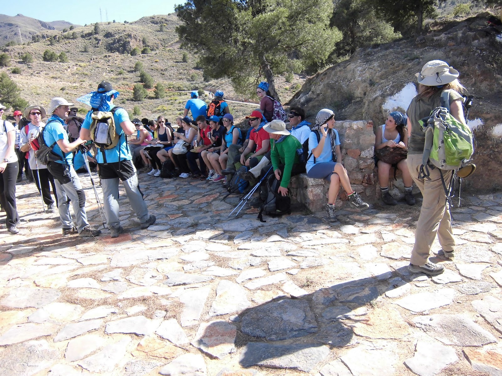 El calor aumenta el cansancio y éste alarga las paradas. Como resultado se acumula un retraso de casi una hora sobre el horario previsto. Empezamos a recibir diferentes llamadas de los siguientes puntos de incorporación que nos esperan impacientes. Los responsables de Íllar, con buen criterio, deciden mantener a su grupo –más numeroso de la docena inicialmente prevista- en el pueblo, antes de llevarlos al punto de incorporación. El grupo de Almería los encuentra casi “disputándose” las pocas zonas de sombra.